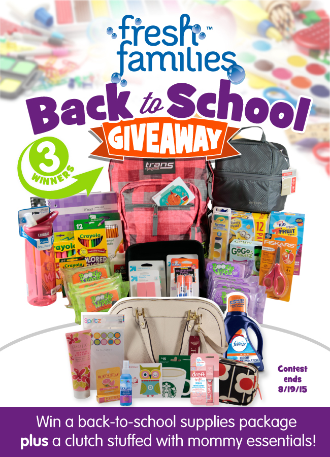 Three winners will take home a backpack loaded with school supplies – including Boogie Wipes. Plus a mommy clutch – full of everything mom needs to make the start of the school year as easy as possible – including a $25 Target gift card, a $25 Starbucks gift card, Downy Wrinkle Releaser Plus, a Dreft Stain Stick and Febreze In-Wash Odor Eliminator.