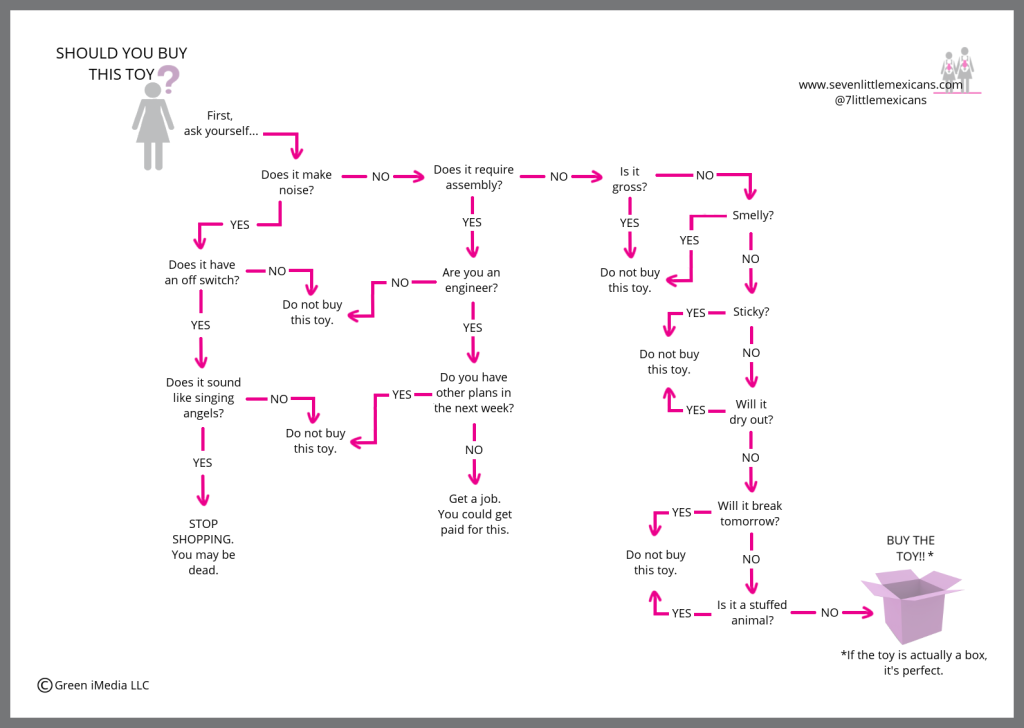 This isn’t the only bad birthday gift. There are others. And to help you in this pursuit of the perfect gift for my child, I’ve created this flow chart to follow. Please print this page and bring it with you the next time you go shopping.