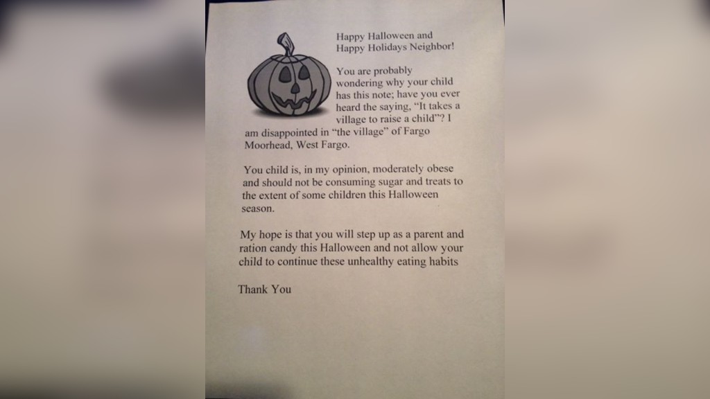 Dear Fargo, ND Village Woman writing Halloween trick notes to fat kids: