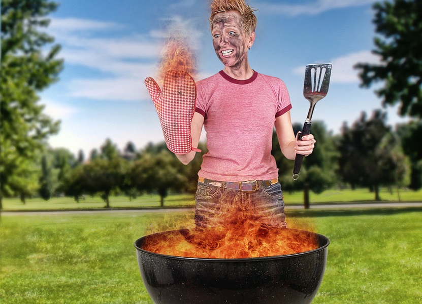 So I went to the store and picked out three “Cowboy Burgers” from the deli counter. We have had these before. They are deliciously stuffed with cheese, jalapeños and onions, and they are the size of my face. I returned home and had a look at the grill. The green cover was filthy and the gas tank was unhooked. If I touched either of those things I was going to get dirty. I hate getting my hands dirty, literally, and I had just put on a clean shirt. So hail no.
